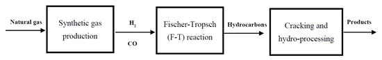 Nowadays, natural gas is taking a more important share in the global energy market compare to other fossil fuel sources. Natural gas conversion to liquids, through the (GTL) process, is achieved using several chemical reaction paths ending with the formation of a range of hydrocarbon products. The Fischer–Tropsch (F–T) process is the most widely applied, this process basically involves the conversion of CO and H2 into several hydrocarbon derivatives [113]. The products of this process can be used directly as fuel such as gasoline, kerosene and diesel, in addition to other special products including lubricants [114]. The produced gas using F–T process usually has low sulfur and aromatic compound contents [115]. In addition, the low CO2 emission, nitrogen oxides, hydrocarbons, and other particulates make GTL process an environmental friendly alternative and one of the cleanest burning fuels [116]. The GTL process mainly contains three main stages (Figure 1); synthetic gas production where the natural gas steam reforms to produce syngas (CO and H2), followed by the Fischer–Tropsch (F–T) reaction to form hydrocarbons, and syncrude. Finally, upgrading the liquids in which liquid hydrocarbons are formed by cracking and hydro-processing. Then, the produced hydrocarbons products meet market specifications [114].
