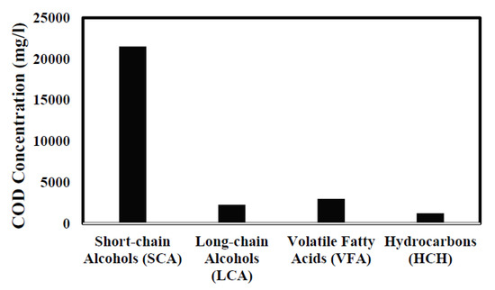 Figure 2 shows the main categories of COD sources with an approximate concentration of COD for each group of hydrocarbons. Short chain alcohol SCA such as methanol, ethanol, propanol and butanol form around 76% of the total COD content. However, long-chain alcohol LCA (hexanol, heptanol, octanol, nananol and decanol) present only 8.2% of the total COD. The rest of COD content is divided into 10.7% acids and 4.5% hydrocarbons.