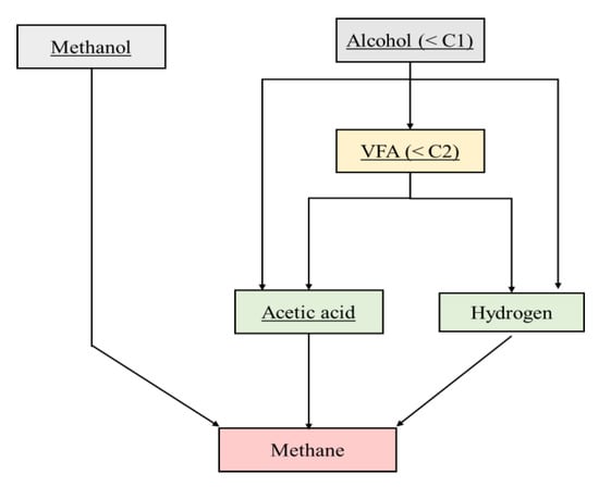 As mentioned in Section 3.2 most of the COD content results from short chain alcohol (SCA) that can be anaerobically degraded and converted into methane (Figure 3). Based on the wastewater effluent composition, the conversion of alcohol is obtained through a set of reactions into methane gas (reactions (1) to (5)). Methanol is directly converted into methane, and the hydrocarbons are not degraded in the process. Other alcohols and VFAs longer than acetate are converted by H2− and acetate-releasing oxidation reactions; the released acetate and H2 accounts for methane production [113].