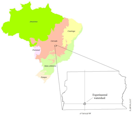This study was conducted in the Capetinga experimental watershed in central-west Brazil. This small experimental watershed (11 km2), maintained by the University of Brasilia, combines different vegetation types of the Cerrado biome under the legal protection of an environmental conservation unit. It is a part of the Federal District, a 5802 km2 autonomous region where the Brazilian capital is located. The Capetinga’s river gallery forest has a tree density of 1010 ind.ha−1, considering trees with diameter at breast higher than 5 cm. Approximately 86 species of trees have been recorded in the area. The most important species are: Amaioua guianensis, Piptocarpha macropoda, Protium heptaphyllum, Licania apetala, Aspidosperma parvifolium, Cryptocarya aschersoniana, Nectandra reticulata, Salacia elliptica, Cecropia pachystachia, Tapirira guianensis [14]. The canopy strata varied from 4 m to 21.5 m in height, with median strata at 10 m [15]. Figure 1 shows the location of the experimental watershed and the six biomes that cover the territory of Brazil.