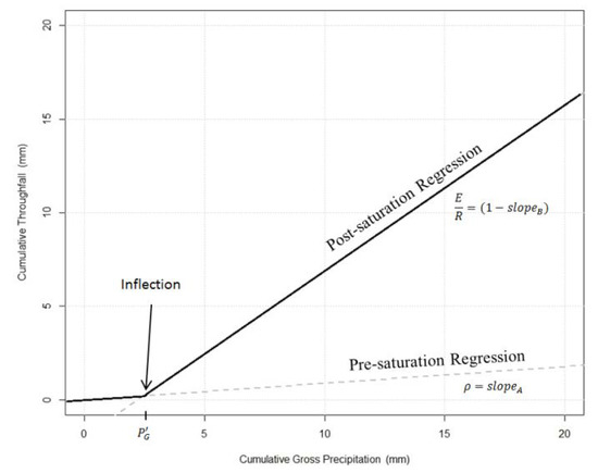 To parameterize the canopy and energy variables, Link [8] proposed a method to derive P′G, S, , and using a single event with high temporal resolution data. This individual storm (IS) method uses piecewise regression to fit two linear models between cumulative throughfall (Pn) and cumulative gross precipitation (PG). The first regression comprises the pre-saturation, while the second one covers the post-saturation canopy condition [9].