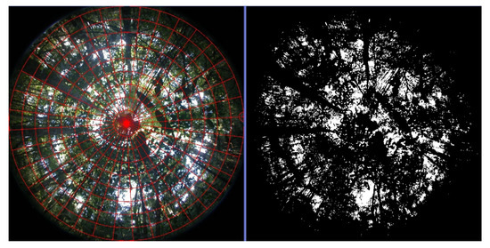 In the present work, we performed a direct measurement of canopy openness at an experimental site as suggested by Zimmermann [13], using a Nikon Coolpix digital camera (Minato City, Tokyo, Japan) and a 180° fish-eye lens. The canopy openness index was calculated using Gap Light Analyzer 2.0 [23]. Figure 4 shows the image processing from the experimental plot.