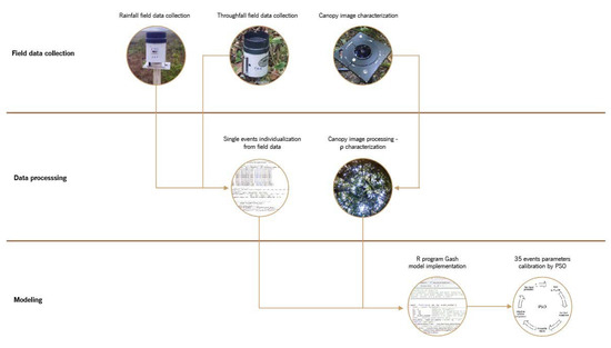 We wrote an R Program language code for computing throughfall using single event rainfall data and the Gash model parameters (P′G, , and ) as input. The automatic calibration of the Gash model missing parameters was made using HydroPSO [24]. The canopy openness index and data of 35 observed events, with 5-min temporal resolution, were used for this propose. The code estimates, P′G and , maximizing the Nash–Sutcliffe Efficiency index (NSE) as the objective function. During the calibration process, we also allowed a small correction (±10%) of incorporating natural variability of canopy structure, and inaccuracy of canopy openness measurements. Figure 5 presents a methodological diagram explaining this phase of the study. Computer code and field data are provided as supplementary material.