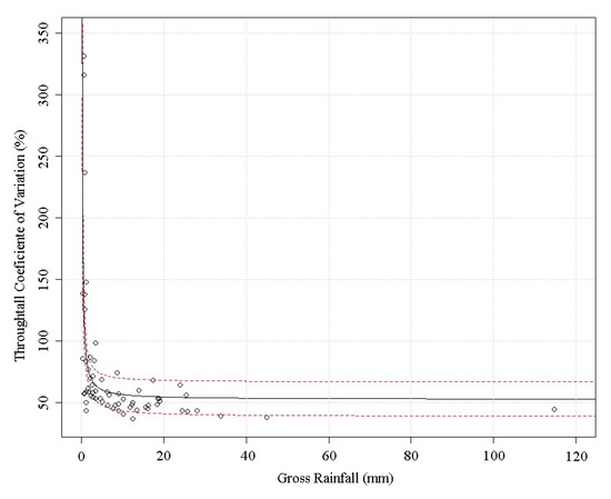 With the fitted model presented in Figure 6, we applied Equation (1) to perform an analysis regarding the uncertainty around the true mean throughfall. For a sample size of 11 rain gauges (tc = 1.812, for 95% Confidence Interval - CI), we found a high mean error for small rainstorm depth, with a stabilization trend of approximately 20%, as the event depth increases. This indicates that studies of the Cerrado forest should increase sample sizes to reduce error around the mean to more acceptable values. This uncertainty around the throughfall value is related to the high variance in measurements resulting from the spatial variability of this phenomenon.