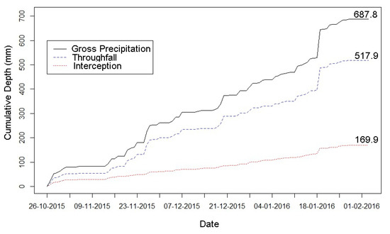 - Crockford, R.H.; Richardson, D.P. Partitioning of rainfall into throughfall, stemslow∠d interception effect of forest type, ground cover and climate. Hydrol. Process. 2000, 14, 2903–2920. [Google Scholar] [CrossRef]
