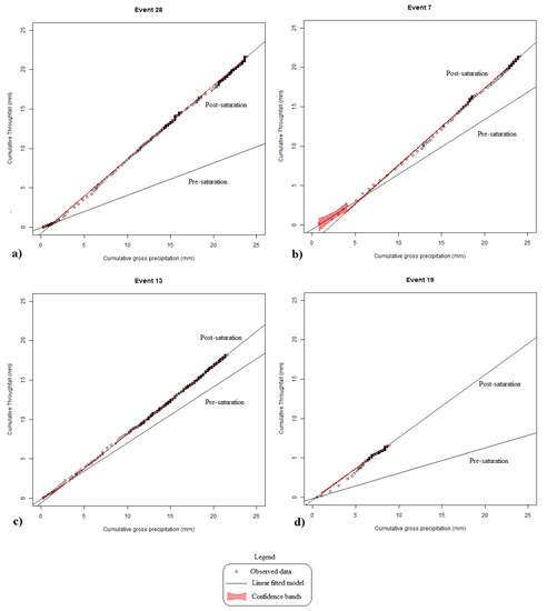 Even though the inflection point is reasonably reached with a root-mean-square—RMS reduction algorithm, the small number of observation points of the pre-saturation regression model leads to a wide confidence interval for the slope. This indicates a poor sampling of the free throughfall. So, therefore, even though we have previously discussed the high uncertainty of the real mean throughfall for small rainfall depth, it appears that the resolution (0.2 mm) of the rain gauges explains the lack of regression points before saturation. Using 0.1-mm-resolution rain gauges would probably have described the free throughfall in more detail. Another possible approach could be increasing the time resolution.