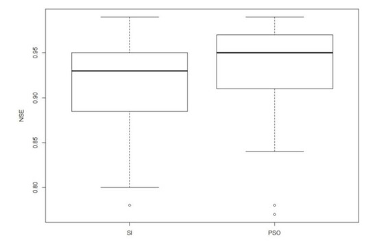 As pointed out before, the observed and calculated adherence measured by the NSE index only shows a small advantage of using PSO when a paired t-test was performed (Figure 9). Nevertheless, performing the same statistical test to the set of parameters shows more significant differences (Table 3). We can conclude, from those results, that both parameterization methods provided well-adjusted equations but with different parameter sets.
