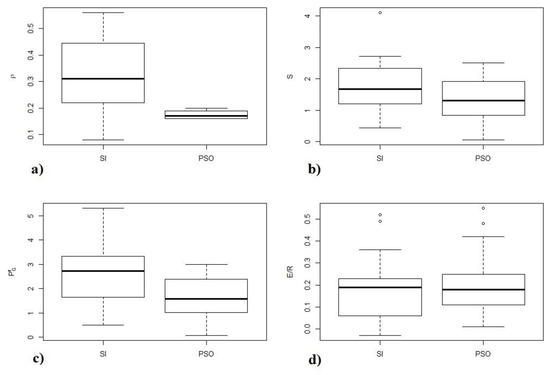 Considering the spread of each data set, an F test to compare variances indicates a statistically significant variance reduction for and P′G when PSO is the parameterization method (p-value—2.2 × 10–16, and p-value—0.04). For the storage (S) and E/R ratio, the statistic test does not show any differences.