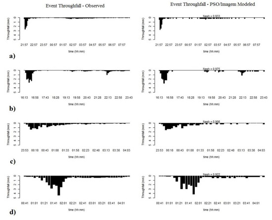 Using rainfall data and the calibrated model parameter from the PSO method, we performed a simulation of each event using the Gash model approach. Figure 11 exhibits some observed and modeled throughfall time series on an event basis. We observed that a 5 min time step simulation is sufficient to reach a high goodness of fit for the Nash coefficient index. The Gash model was able to precisely simulate the time series throughfall behavior on an event basis.