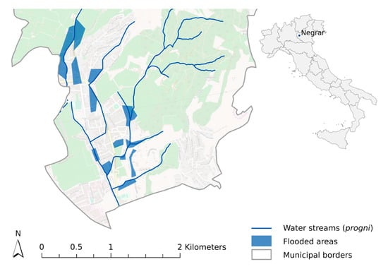 The study area is the municipality of Negrar, located in the Veneto Prealps, north of Verona. The municipality ranges between 70 and 860 m a.s.l. Three streams (locally known as progni) flow through the municipality, progno di Negrar, Fosson, and progno di Novare, all flowing into the Adige river downstream. Negrar is divided into smaller urban conglomerates that are mainly located in the floodplain in the lower part of the municipality. The population steadily increased in the past years and it amounts to approximately 17,093 residents as of 2018.