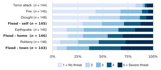 The majority of respondents feel relatively safe living in the area, with the majority of respondents reporting 4 (41%) or 5 (31%) on the (1 min. 5 max) Likert-type scale. When it comes to the perceived threat caused by floods (see Figure 2), respondents show a much greater concern for the town as a whole compared to themselves. These results show an optimistic bias in the interviewees’ responses about flood risk awareness. Indeed, the respondents tend to see themselves in a safer position when compared to the town as a whole. Robbery seems to be the greater concern when it comes to personal safety, followed by earthquakes. Drought, fires, and terror attacks are not concerning to the residents.