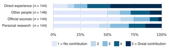 Rather than assessing the individual flood risk knowledge, we analysed the influence of different sources of information on individual knowledge. Sources included direct experience, other people, official information, and personal research. The results show that it is primarily direct experience with floods, followed by personal research of information, and knowledge passed on by others that contribute to personal flood risk knowledge. Remarkably, official sources play a minor role (see Figure 3).