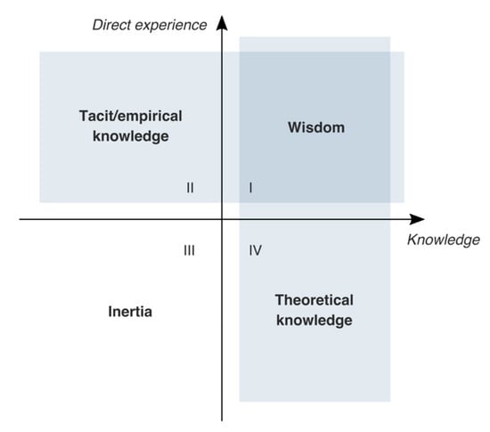 The concept of theoretical knowledge was first brought up by Aristotle in his work titled Nicomachean Ethics, in 350 B.C. In Book VI [], he argued that theoretical knowledge is the one of the spectator, i.e., what comes from “standing back” and “looking on”. In this context, the spectator can be the one who gains knowledge from secondary sources, without having experienced any flood. The concept of tacit knowledge was theorized by Polanyi [], who described it as a knowledge that comes from direct experience, hidden and implicit. In philosophy, it is better known as empirical knowledge, which is knowledge derived from experience, as opposed to knowledge derived from deductive reasoning or theory.