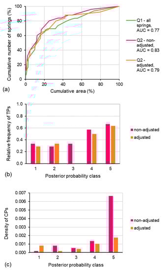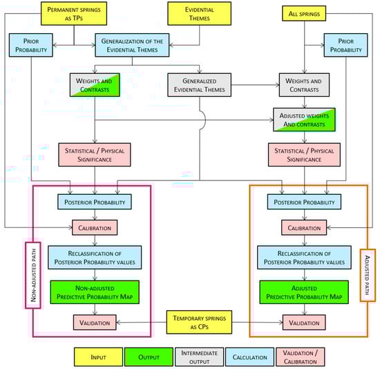 - comparison of the adjusted posterior probability map (step 4) with the posterior probability map, obtained using the standard WofE approach (step 1), and their derived reclassified maps, through calibration and validation techniques (Table 1). In this phase, we use the temporary springs, as CPs, for the validation of the adjusted map.
