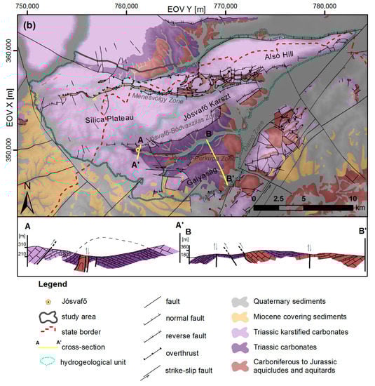 - Mádl-Szőnyi, J.; Tóth, Á. Basin-scale conceptual groundwater flow model for an unconfined and confined thick carbonate region. Hydrogeol. J. 2015, 23, 1359–1380. [Google Scholar] [CrossRef]