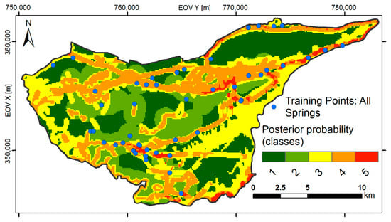 | Reclassified Predictive Probability Map | Scientifically defensible response themes, expressed as probability maps, require additional interpretation before being usable for most of the end-user purposes. This is due to the excessive number of classes, which is inappropriate in practical purposes (e.g., land use regulations) [37,38,39]. | Sorichetta, Masetti, Ballabio, Sterlacchini and Beretta [38], in their study on groundwater vulnerability assessment, have demonstrated the reliability and suitability of the geometrical interval classification method for reclassifying posterior probability values and obtain maps consisting of few classes (5). The geometrical interval classification method which ensures that each class has approximately the same number of different post probability values. |