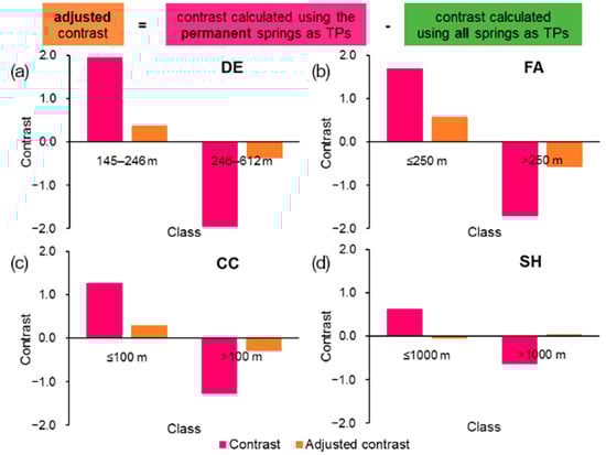 - calculation of the adjusted contrast and weights, by subtracting C, W+ and W− calculated using all springs as TPs (step 2) from C, W+ and W− calculated using the permanent springs as TPs (step 1);