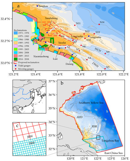 Figure 1. Study area with: (a) Regional setting of shoals and channels at Tongzhou Bay situated at the southern Jiangsu coast. Indicated are past reclamation activities, including the outline of the proposed Tongzhou Bay port (red dashed line) [49]. Measurement locations at Tongzhou Bay, where M-stations (blue) are waterlevel gauges and N-stations (red) measured current velocity and direction and sediment concentration among others; (b) Computational domains of the Jiangsu Regional Model (red) and Tongzhou Bay Model (blue); (c) A close-up of the grid domain shows the coupling and different resolutions between the two “online” coupled grids of the Jiangsu coast (JRM) and Tongzhou Bay (TBM).