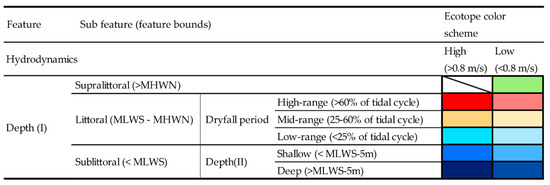 Ecotopes in the Tongzhou Bay system are quantified using the ZES.1 method [78], developed for saline open waters ecosystems in the Netherlands, but also applied for the complete Wadden Sea covering the coastline of Germany and Denmark as well [79]. The Bouma et al. [78] classification scheme is based on the flooding frequency, substrate, salinity, and flow velocity. However, the analysis of available field data [49,57] revealed only small variations in salinity as well as a homogenous soft substrate over the Tongzhou Bay domain, and therefore we simplify their classification scheme by omitting subdivisions based on salinity and substrate. Depth classification is based on tidal data (I), such as Mean High Water Spring (MHWS) and Mean Low Water Spring (MLWS). An additional depth sub classification (II) is based on a certain depth below MLWS, consistent to Bouma et. al. [78]—see Figure 2. The flow velocity distinguishes low-energy from high-energy waters with a threshold value of 0.8 m/s. This value approximates conditions for the initiation of bed forms, signaling a change in ecotope distribution in the Wadden Sea [78,79]. The classification based on the dryfall period is largely consistent with ZES.1 method, although a lower limit of the high-range littoral of 60% was chosen to better match bird habitat field observations [32,80]. By assigning a color scheme to each ecotope (Figure 2), an ecotope distribution map can be drawn.