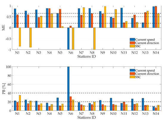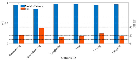 The model performance was quantified by computing Model Efficiency (ME) and bias (PB). The Nash–Sutcliffe Model Efficiency coefficient [89] is defined as: