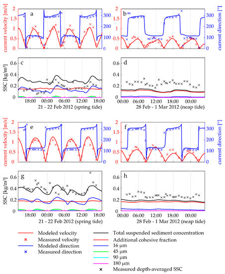 The measured suspended sediment concentrations vary typically between 150 and 300 mg/L, which are typical values for the Jiangsu coast and Tongzhou Bay [55,59]. SSC varies fairly little over the tidal cycle—especially during neap tides. This suggests the presence of a slow-settling sediment fraction of which the sediment concentration is fairly independent of the hydrodynamics, providing a background sediment concentration. During spring tide, a tidally varying sediment concentration is superimposed on this background concentration, as more sediments are resuspended from the bed. This background concentration was the motivation for adding a cohesive sediment fraction to the model of Yao et al. [84]. The concentration modelled agrees better with the data during spring than during neap tide. At station N1, the measured concentration during neap tide is higher than during spring tide. The reasons for the higher neap tide concentrations are probably related to higher wind velocities during neap tide conditions (up to+m/s) than during spring tide conditions. The measured SSC at station N7 is higher during spring than during neap, and also better reproduced by the model (except for a slight underestimation of neap tide SSC). The model also suggests that the bulk of the suspended sediment is the fine cohesive sediment fraction and the fine silt fraction (spring tide only).