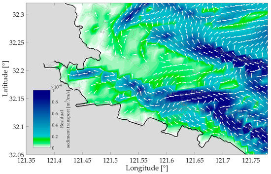 Figure 6. Calculated mean total sediment transport at Yaosha for four consecutive spring-neap cycles. To illustrate the significant mean transport over Yaosha, a lower transports rate limit is included of 7.0 × 10−6 m3/m/s.