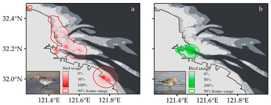 Figure 8. Ecotope map of Tongzhou Bay overlaid with Kernel density home ranges generated from satellite-tracking data of the (a) Bar-tailed Godwit and (b) Great Knot.