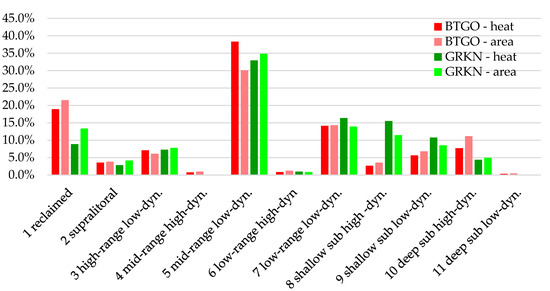 To determine ecotopes important for the two shorebird species (Bar-tailed Godwit and Great Knot), we analyse the satellite-tracked distributional data in two spatial scales. First, to show the areas where these species generally occurred within the entire study area, the 90% Kernel density contours, representing the home range of the species, are calculated and overlaid onto the ecotope classifications (Figure 8). Bar-tailed Godwit and Great Knot occur mostly in the mid-range low dynamic littoral zone, with 30% and 35% of their 90% home range areas overlapping with this ecotope type (Figure 9).