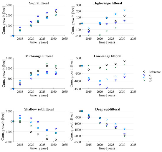 Figure 11. Net cumulative ecotope growth during 20 years for v1, v2, v3 and the reference case.