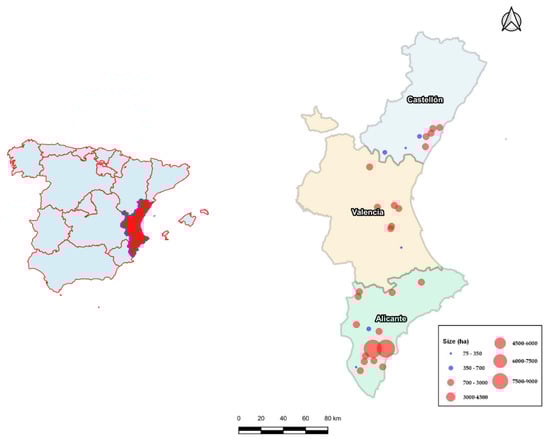 In Spain, the irrigated area amounts to more than 3.7 million hectares of which 7.7% belong to the Valencian Community. The water, with which this surface is supplied, to a large extent, is managed by WUAs. These WUAs collectively managed the irrigation systems and they are recognized all over the world [,,]. They are non-profit organizations, and have their own rules to manage water distribution and resolve conflicts []. Land-tenure structure is characterized significantly by small plots; hence it can be referred as a small-holding system, as most farmers own less than 1 ha []. In the Valencian Community, there are more than 700 WUAs.
