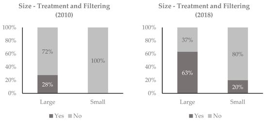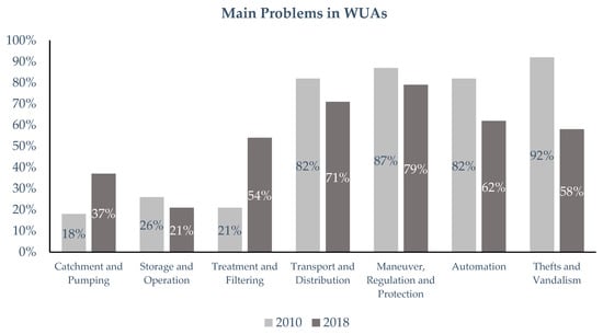 An interesting correlation was found in the interaction between the WUAs’ size and the problems with Treatment and Filtering. Although in 2010 no correlation was observed (p = 1.00), in 2018 the p-value obtained was of 0.09. Figure 3 shows that for 2010, both large and small WUAs do not present differences with these kinds of problems, with 0% in small ones and 28% for the large ones. However, in 2018, an important increase for small WUAs is observed with 20% of small systems presenting problems with filtering, while in large ones 63% showing this kind of problems. This situation cannot be explained by an error of the devices because filtering and treatment facilities are designed for a lifetime warranty of at least 20 years. However, the lack of maintenance or the absence of qualified technicians at the small WUAs can explain the malfunction of the filtering and treatment systems. This maintenance requires a very accurate knowledge of the filtering process, not only in the design, but also in the exploitation of the WUA [].