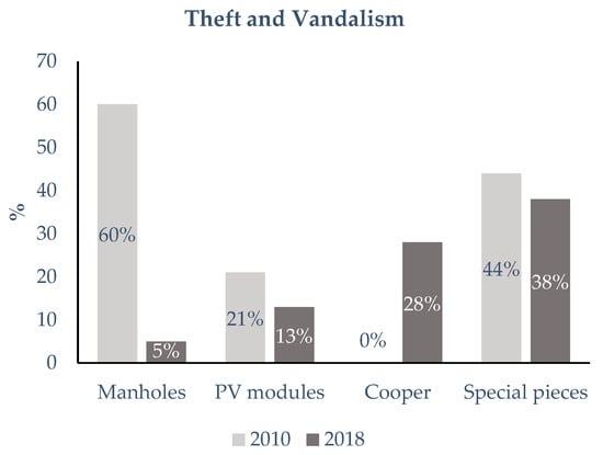 Taking into account that theft and vandalism were one of the most pressing problems at WUAs, a more detailed study was carried out regarding the elements affected. A trend can be observed of the reduction on thefts of heavy iron material from elements, such as manholes, doors and gates (60% in 2010 to 5% in 2018) and a considerable increase in theft of copper from electric wiring (0% in 2010 28% in 2018). The other two groups have remained more or less constant with a slight decrease from 2010 to 2018 (21% to 13% and 44% to 38% in photovoltaic modules and valves, respectively). These comparisons can be observed in Figure 5.