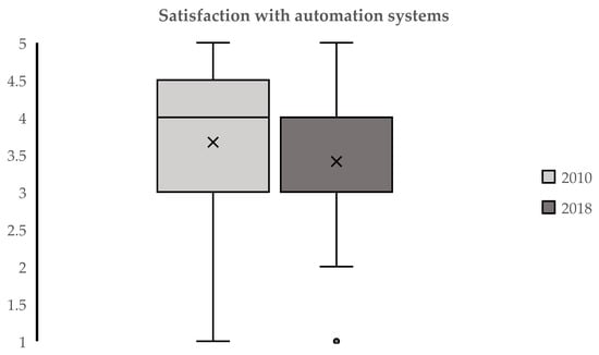 Another aspect to consider in more detail is related to automation performance. As we have seen previously, problems of automation have decreased from 82% in 2010 to 62% in 2018. However, regarding satisfaction with the automation system using a Likert scale, there have been no great differences from 2010 to 2018, as shown in Figure 6.