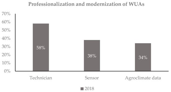 Moreover, we consider that the professionalization of a WUA is accomplished when there is a technician, they use sensors for irrigation management and they manage agro climatic parameters for irrigation programming. This fact implies an upgrade in the modernization degree of WUAs. However, as it is observed in the results of this paper these changes are not generalized in the entire region. We can observe in Figure 8b, that there is a relation with the size of the WUA, 43% of the large WUAs interviewed have adopted the three elements in their daily operation while none of the small ones have introduced them (p-value of 0.047 in Fisher’s exact test).