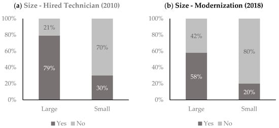 (a) Relation between WUAs size and hiring of technicians; (b) Relation between WUAs size and modernization, considering the hiring of a technician and the use of sensors or agro climate data for irrigation calculation.