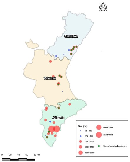 The study area of this work focuses on the Valencian Community. The sample consists of 30 Water User Association, 7 of which are located in the province of Valencia, 8 in Castellon and 15 in Alicante. In Figure 1, the WUAs selected are located geographically and categorized by size. The WUAs were divided in two groups by their size, “Small WUAs” with a supplied surface less than 700 ha (in blue at Figure 1) and “Large WUAs” with an irrigated surface bigger than 700 ha (in red at Figure 1).