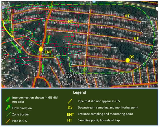 Schematic of Study Zone 2. The entrance (ENT) and downstream (DS) locations at which continuous monitoring stations were installed are indicated, as well as the household taps at which water quality grab samples were collected. (Source of satellite images and study zone schematic: Google Earth and IDAAN’s GIS database).