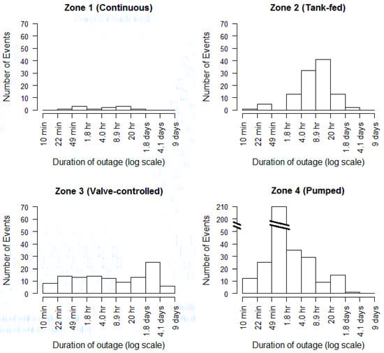 The distributions of outage durations at each of the downstream monitoring stations are shown in Figure 4. The tank-fed zone (Zone 2) had 107 outages lasting up to 3 days. A typical outage began during the afternoon when the upstream storage tanks serving Zone 2 drained, and ended around midnight once the level in the tanks recovered. Longer interruptions occurred when the upstream storage tanks were without water for longer because of a supply deficit in the overall network caused by a pipe break or pump or treatment plant shutdown.