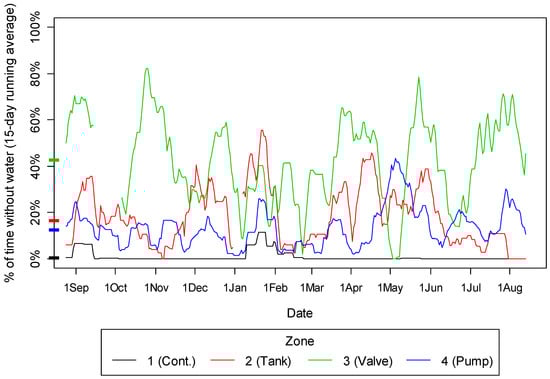 Fifteen-day running average of the percent of time that supply was off in each zone. For each day, the average percent of time water was off during the 15 nearest days is shown. Values are only shown if at least 7 days (out of 15) of data were available. Colored dashes on the y-axis mark the average percent of time water was off in each zone.