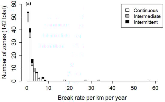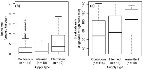 The potential relationship between the break rate and supply continuity was investigated by classifying supply into three categories. “Continuous” supply meant that the zone only lost supply when a large portion of Arraiján was without water; “Intermittent” supply meant that the zone regularly was without water, and; “Intermediate” supply meant that the zone normally had continuous supply but was vulnerable to losing supply when pressure was low in the main network. Break rates and break rate ranks are compared by supply type in Figure 7b,c. In one-way permutation tests for independence (two-tailed tests, classifying supply and age categories as ordered factors, and using break-rate ranks), higher break rates were significantly associated with more intermittent supply (p = 0.042) and higher pipe age (p = 0.030). In a permutation test for independence where both supply and pipe age categories were considered simultaneously, the association almost met the threshold for significance (p = 0.058).