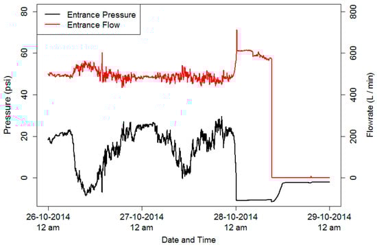 Continuous pressure and flow monitoring data from the Zone 3 (valve-controlled) entrance monitoring station during a break in the 4-inch pipe supplying Zone 3 (downstream of the entrance) at approximately 12 a.m. 28 October 2014.