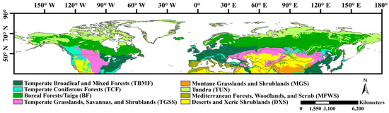 Study area and the distribution of biome types. The land cover classification map was obtained from the Olson et al. [33].
