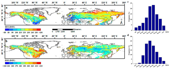 The spatial distribution of average SOS (a) and EOS (b) of vegetation area in the Northern Hemisphere during 1982–2015. (c,d) shows the frequency distribution of 34-year averaged SOS and EOS, respectively.