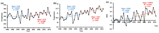 Changing trend of annual (a) precipitation, (b) temperature, and (c) SPEI during 1982–1998 and 1999–2015, respectively. Each year value was averaged of all pixels during the growing season. The blue line is the linear fit of 1982–1998; and the red line is the linear fit of 1999–2015.