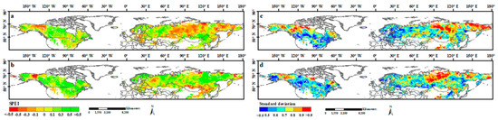 Spatial patterns of the SPEI during the two study periods were reflected by their mean values and the standard deviation. Significantly different spatial patterns in the mean SPEI were observed both before and after 1998 (Figure 4). In 1982–1998, the regions with a low SPEI (<−0.1) accounted for 27.7% of the study area and were mainly located in the high and mid-latitudes, including the middle and northeastern part of Russia, northwestern Canada, and northern Kazakhstan (Figure 4a). However, after 1998, the regions with a low SPEI decreased to 13.6% and were mainly concentrated in low-latitude areas, including northern Mongolia and northeastern China (Figure 4b). Overall, the high-latitude areas underwent a considerable increase in SPEI (wetting trend) in 1999–2015. Compared with the SPEI, the standard deviation also showed a high spatial heterogeneity for the study area, but no apparent difference was observed between the two study periods. Most standard deviations were in the range of 0.5 to 0.9. Regions with a high standard deviation were observed mainly in the northeastern and north-central parts of Russia and northwestern Canada, whereas areas with low standard deviations were widely concentrated in the middle- and low-latitude regions (Figure 4c,d).