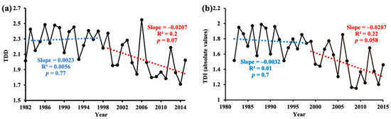 To compare the changes in drought duration and intensity before and after the critical time point of 1998, the total drought duration (TDD) and total drought intensity (TDI) were then calculated as the sum of the duration and intensity of the drought events that occurred in 1982–1998 and 1999–2015, respectively.