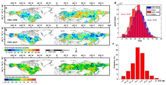 The spatial distribution of total drought duration (TDD) of each pixel in Northern Hemisphere during 1982–1998 and 1999–2015. (a,b) exhibited the spatial distribution of TDD during 1982–1998 and 1999–2015, respectively; (c) showed the spatial patterns of the TDD different between 1982–1998 and 1999–2015. (d) represented the frequency distribution of TDD in 1982–1998 and 1999–2015. (e) represented the frequency distribution of the TDD different between 1982–1998 and 1999–2015.