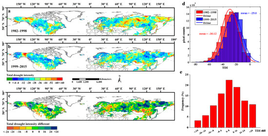 The spatial distribution of total drought intensity (TDI) of each pixel in Northern Hemisphere during 1982–1998 and 1999–2015. (a,b) exhibited the spatial distribution of TDI during 1982–1998 and 1999–2015, respectively; (c) showed the spatial patterns of the TDI different between 1982–1998 and 1999–2015. (d) represented the frequency distribution of TDI in 1982–1998 and 1999–2015. (e) represented the frequency distribution of the TDI different between 1982–1998 and 1999–2015.