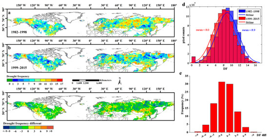 The spatial distribution of drought frequency (DF) of each pixel in Northern Hemisphere during 1982–1998 and 1999–2015. (a,b) exhibited the spatial distribution of DF during 1982–1998 and 1999–2015, respectively; (c) showed the spatial patterns of the DF different between 1982–1998 and 1999–2015. (d) represented the frequency distribution of DF in 1982–1998 and 1999–2015. (e) represented the frequency distribution of the DF different between 1982–1998 and 1999–2015.