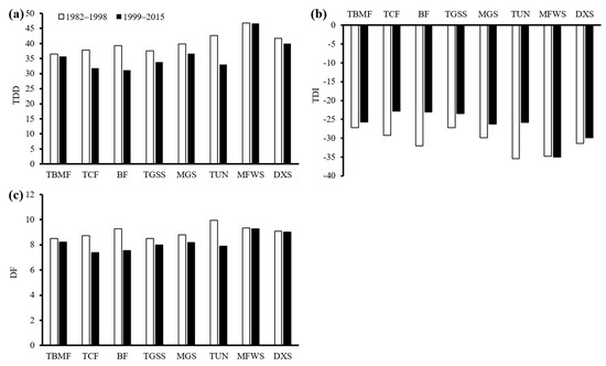 The average total drought duration (TDD) (a), total drought intensity (TDI) (b), and drought frequency (DF) (c) at each biome during 1982–1998 and 1999–2015.